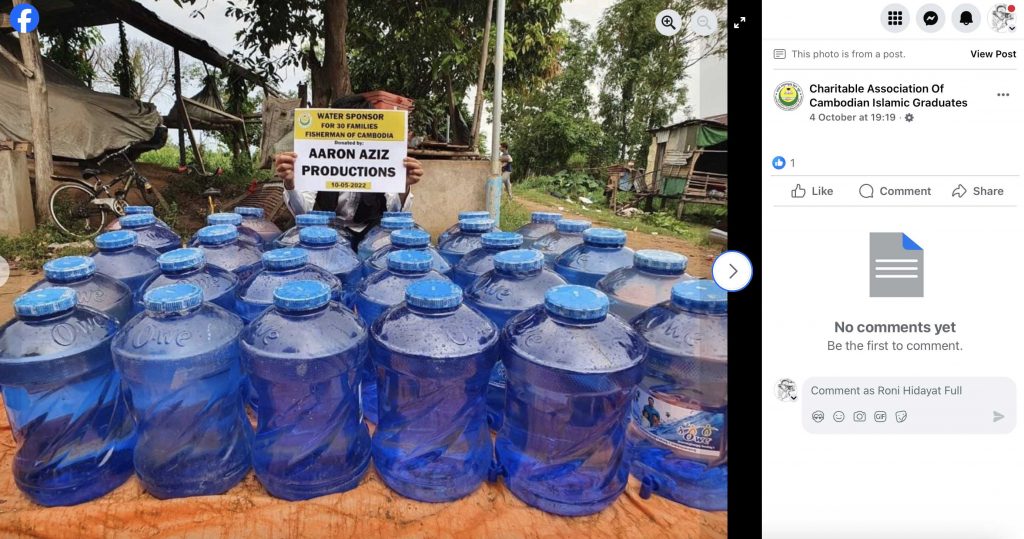 “Atas kerjasama dan bantuan beliau, kami dapat menyalurkan sumbangan daripada penderma Malaysia dan Singapura untuk membantu anak-anak yatim, fakir miskin dan nelayan di Kemboja,” ujar wakil CACIG dalam kenyataan di Facebook rasmi mereka.