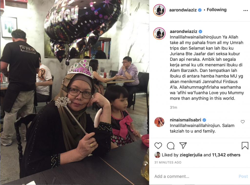 Pelakon popular Aaron Aziz kehilangan insan yang paling disayangi apabila ibunya telah disahkan meninggal dunia hari ini.