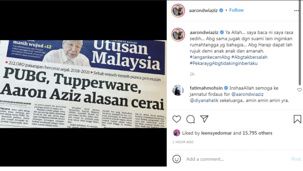 “PUBG, Tupperware, Aaron Aziz, antara alasan cerai,” tulis tajuk di artikel tersebut yang disiarkan pada Jumaat.