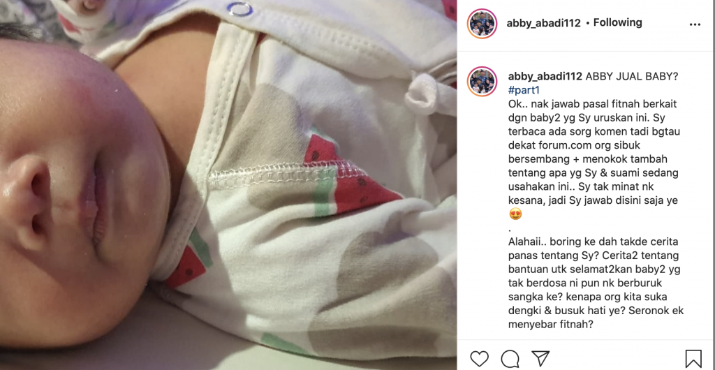 Menerusi luahan di Instagram miliknya, Abby menafikan dakwaan berkenaan dan menyatakan apa yang dilakukannya kerana mahu menyelamatkan bayi-bayi yang tidak berdosa.