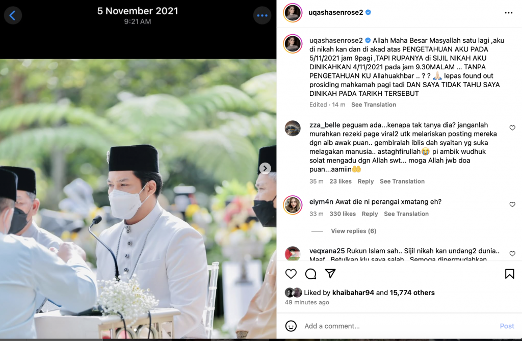 Dalam perkongsian terbaharu di akaun Instagram miliknya, pelakon berkenaan mempersoalkan status pernikahannya memandangkan tarikh majlis nikah dan tarikh di sijil nikah berbeza.