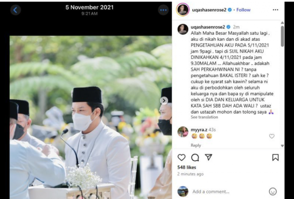 “Allah Maha Besar Masyallah satu lagi , aku di nikah kan dan di akad atas PENGETAHUAN AKU PADA 5/11/2021 jam 9pagi , tapi di SIJIL NIKAH AKU DINIKAHKAN 4/11/2021 pada jam 9.30MALAM …