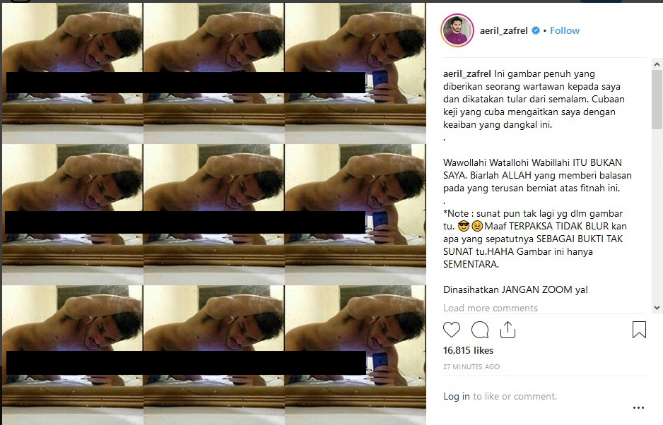 Dalam pada itu, suami kepada pelakon Wawa Zainal itu juga turut memuat naik gambar berkenaan di Instagram dengan tidak mengaburkan gambar di bahagian alat sulit.