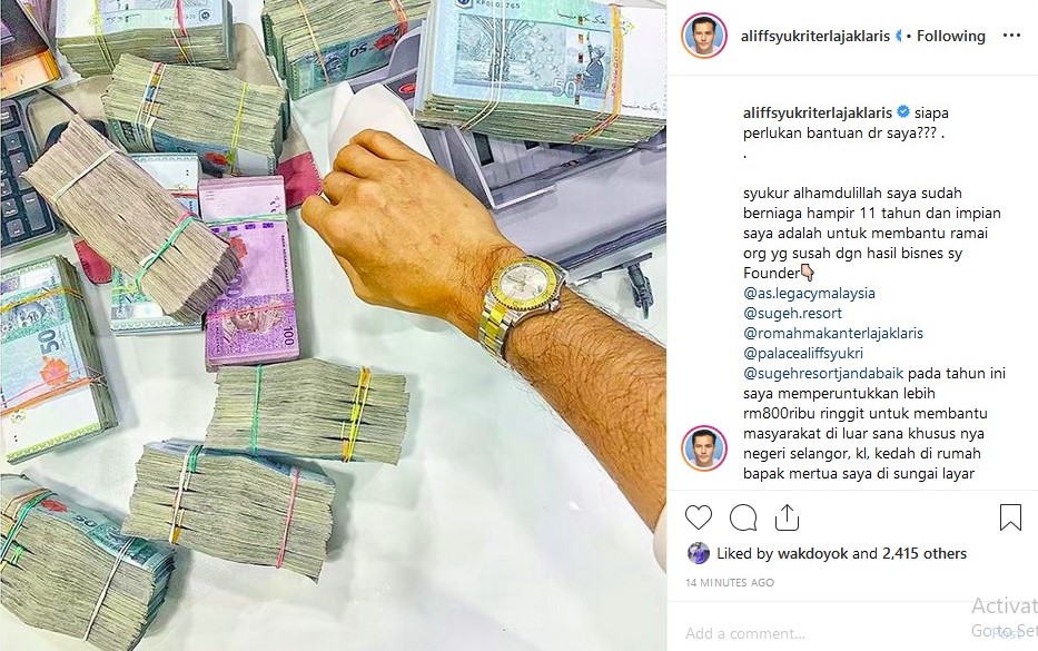 “Saya memperuntukkan lebih RM800,000 untuk membantu masyarakat di luar sana khususnya negeri Selangor, Kuala Lumpur, Kedah di rumah bapak mertua saya di Sungai Layar Sungai Petani, Negeri Sembilan rumah nenek saya dengan duit ini,” ujarnya menerusi posting yang dimuat naik di Instagram.