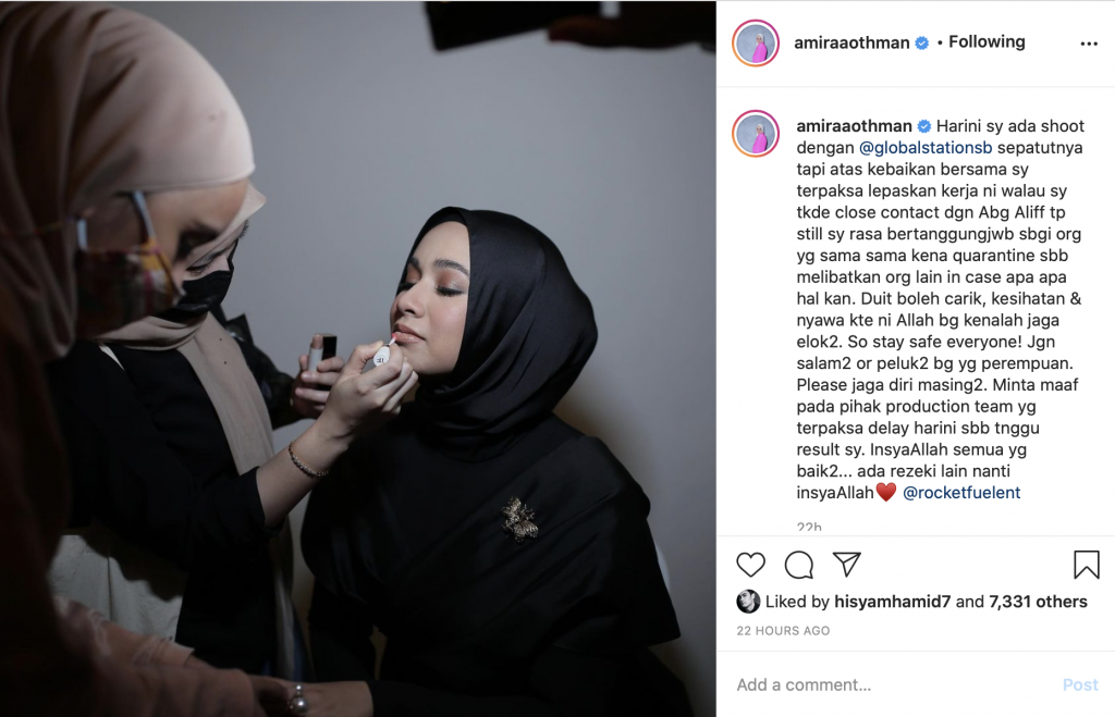 “Hari ini saya ada shoot dengan @globalstationsb sepatutnya, tapi atas kebaikan bersama saya terpaksa lepaskan kerja ni walau say takde close contact dengan Abg Aliff still sy rasa bertanggungjawab sebagai orang yang sama sama kena quarantine sebab melibatkan orang lain in case apa-apa hal kan.
