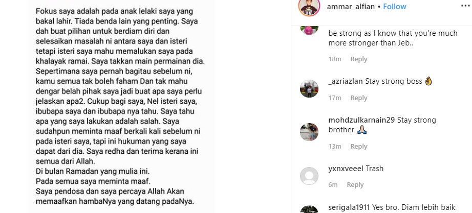 Ammar menerusi Instagramnya, hari ini menyatakan ini merupakan kenyataan terakhirnya berhubung isu yang melanda rumah tangganya kerana selepas ini mahu memberikan fokus terhadap kelahiran anak lelakinya yang bakal dilahirkan tidak lama lagi.