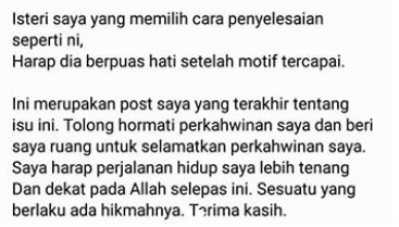 “Di bulan Ramadan yang mulia ini, pada semua saya meminta maaf, saya pendosa dan saya percaya Allah akan memaafkan hambaNya yang datang padaNya. Isteri saya yang memilih cara penyelesaian seperti ini, harap dia berpuas hati setelah motifnya tercapai.