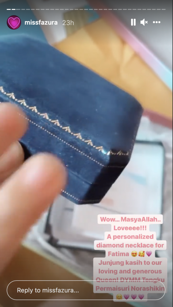 “Wow… masyaAllah… Loveeee!!! A personalised diamond necklace for Fatima. Junjung kasih to our loving and generous Queen! DYMM Tengku Permaisuri Norashikin.