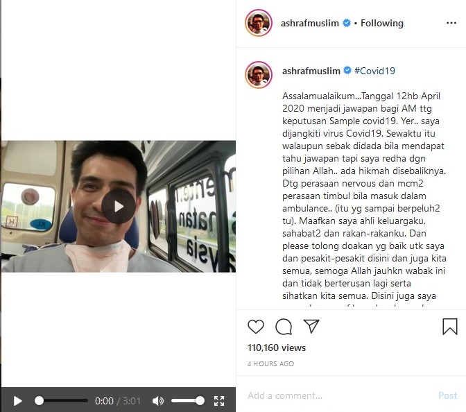Pelakon Ashraf Muslim akhirnya mendedahkan bahawa dirinya telah dijangkiti virus Covid-19 menerusi keputusan yang diperoleh pada 12 April lalu.