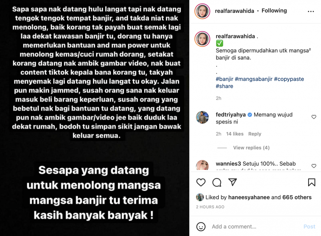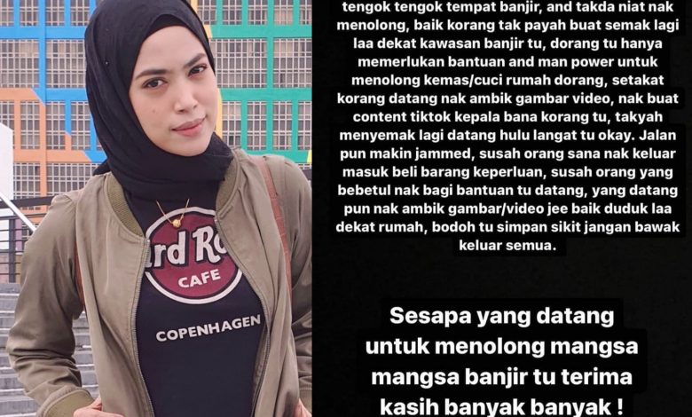 “Dorang tu hanya memerlukan bantuan and man power untuk menolong kemas/cuci rumah dorang. Setakat korang datang nak ambil gambar video, nak buat content TikTok kepala bana korang tu, takyah menyemak lagi datang Hulu Langat ok,” luahnya menerusi satu posting di Instagram.