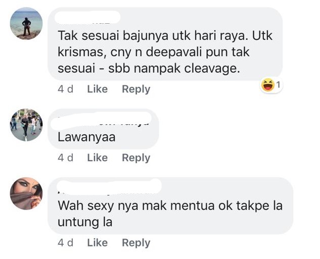 Malah ada netizen secara sinis mengatakan yang bajunya itu juga seakan-akan tidak sesuai perayaan Krismas, Tahun Baru Cina dan Deepavali kerana kelihatan seksi.