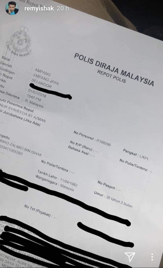 Remy menerusi Insta Story berkata dia membuat laporan itu kerana lelaki itu mengugut untuk menyebarkan fitnah terhadap dirinya.