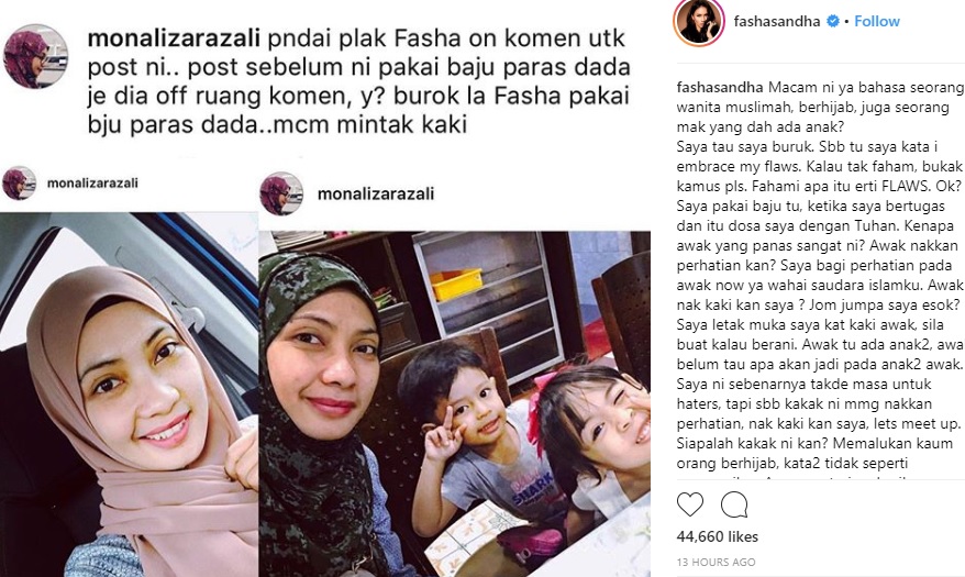 Bengang dengan komen itu, Fasha bertindak memuatnaik foto wanita tersebut bersama dua anaknya di entri Instagram beserta luahan hatinya terhadap perkara tersebut.