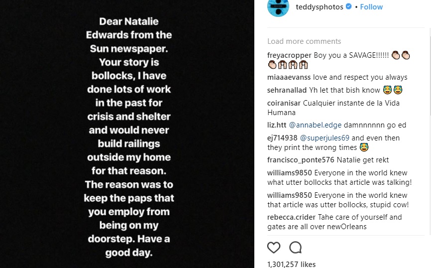 Menjelaskan laporan tabloid itu, Ed telah memuat naik nama wartawan yang menulis berita itu di laman Instagramnya sekali gus menerangkan perkara sebenar kenapa dia membina tembok terbabit.