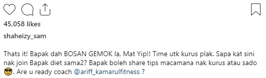 “That’s it! Bapak dah bosan gemuk la, Mat Yip!! Time untuk kurus pula. Siapa kat sini nak join Bapak diet sama-sama? Bapak boleh share tips macam mana nak kurus atau sado,” tulisnya.