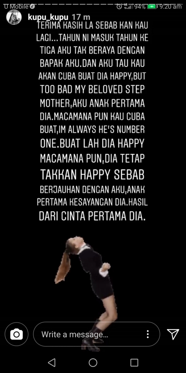 Dalam luahan itu juga, Nabila mendedahkan dia sudah tiga tahun tidak beraya bersama bapanya disebabkan perangai ibu tiri yang sering kali memburuk-burukkan dirinya.
