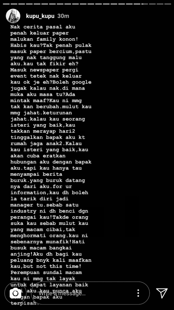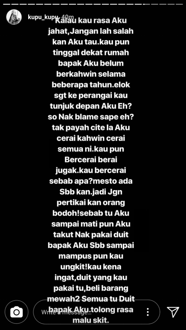 “Kalau kau isteri yang baik, kau akan cuba eratkan hubungan aku dengan bapa aku. Tapi kau hanya tahu menyampai berita buruk,” tulis Nabila.