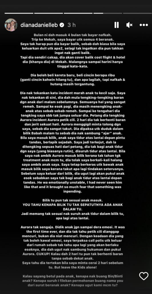 “Tapi dia sendiri cakap dia akan cover balik cost flight & hotel dia (hanya dia) di Mekah. Malangnya sampai hari ini hanya tinggal kata-kata. Dia boleh beli kereta baru, beli cincin berapa ribu (ganti cincin kahwin hilang tu) dan apa lagilah, tapi nafkah & outang masih tergantung,” ujarnya.