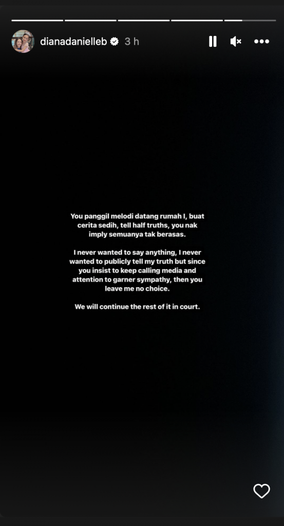 Perkara tersebut telah dikongsikan sendiri oleh Diana menerusi satu posting di Insta Story miliknya.