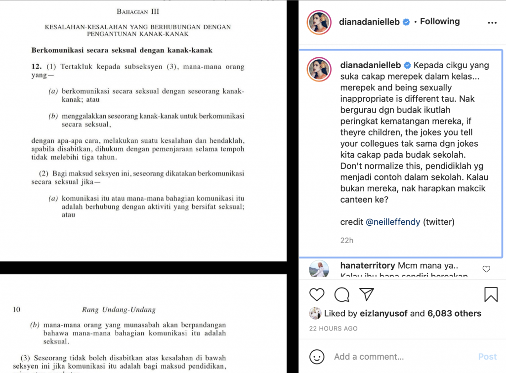 Selain itu, Diana turut memuat naik gambar yang menunjukkan rang undang-undang berkenaan kesalahan dan hukuman berkaitan berkomunikasi secara seksual dengan kanak-kanak.