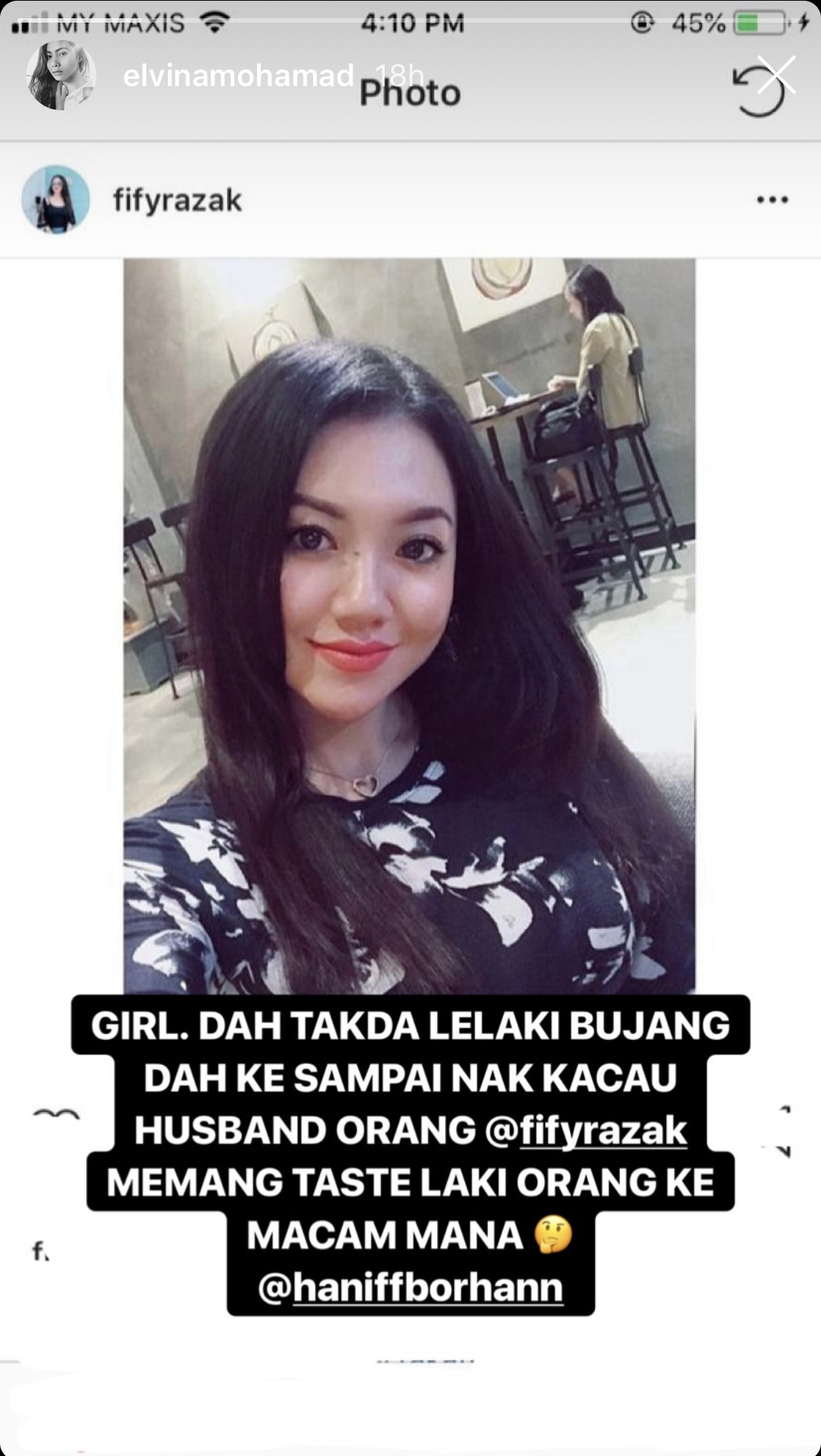 “Girl. Dah tak ada lelaki bujang dah ke sampai nak kacau husband orang @fifyrazak. Memang taste laki orang ke macam mana @haniffborhann.
