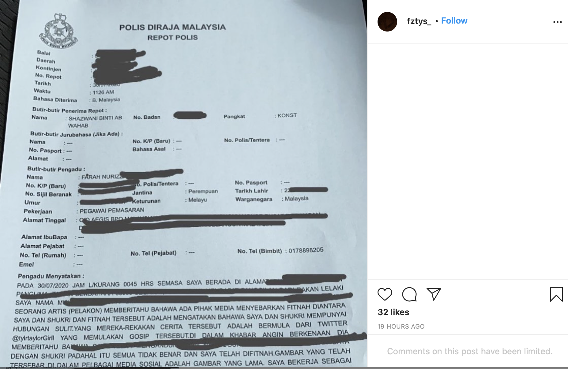 Menerusi perkongsian di Instagram @fztys_, wanita berkenaan telah didakwa bahawa dirinya telah difitnah menerusi pendedahan di Twitter.