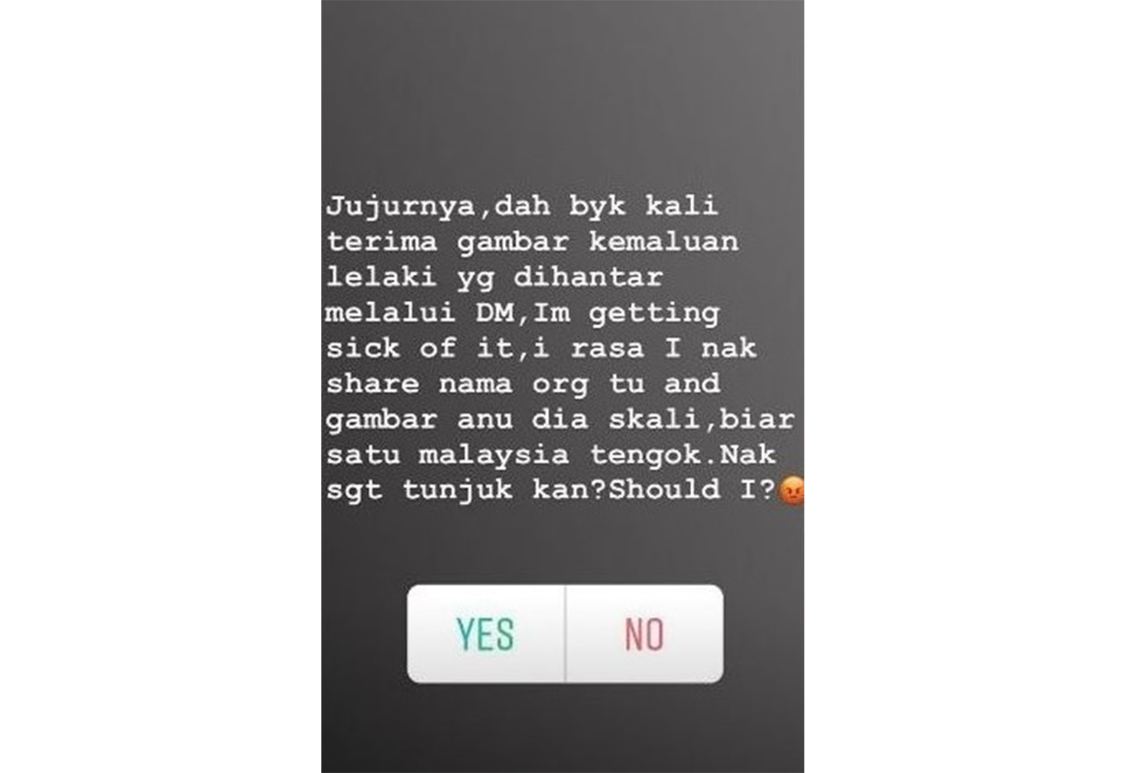 “I rasa I nak kongsi nama orang tu dan gambar ‘anu’ dia sekali, biar satu Malaysia kenal. Nak sangat tunjukkan? Should I?,” tulisnya sambil bertanyakan kepada pengikut Instagramnya. – KopiPlanet.com