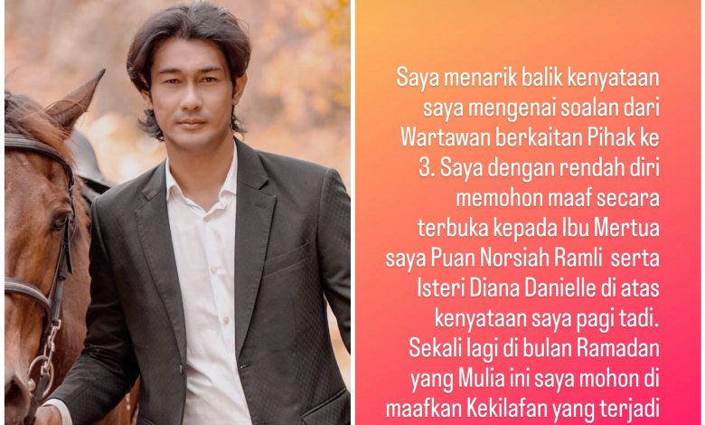 “Saya menarik balik kenyataan mengenai soalan wartawan berkaitan pihak ketiga. Saya dengan rendah hati memohon maaf secara terbuka kepada ibu mentua, Norsiah Ramli di atas kenyataan saya semalam.