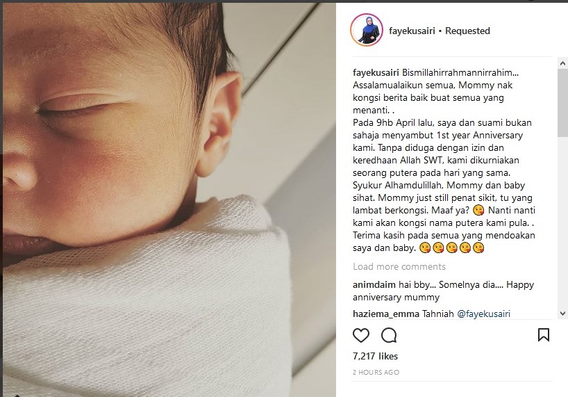“Tanpa diduga, dengan izin dan keredaan Allah SWT, kami dikurniakan seorang putera pada hari yang sama. Syukur alhamdulillah, mommy dan baby sihat,” ujarnya.
