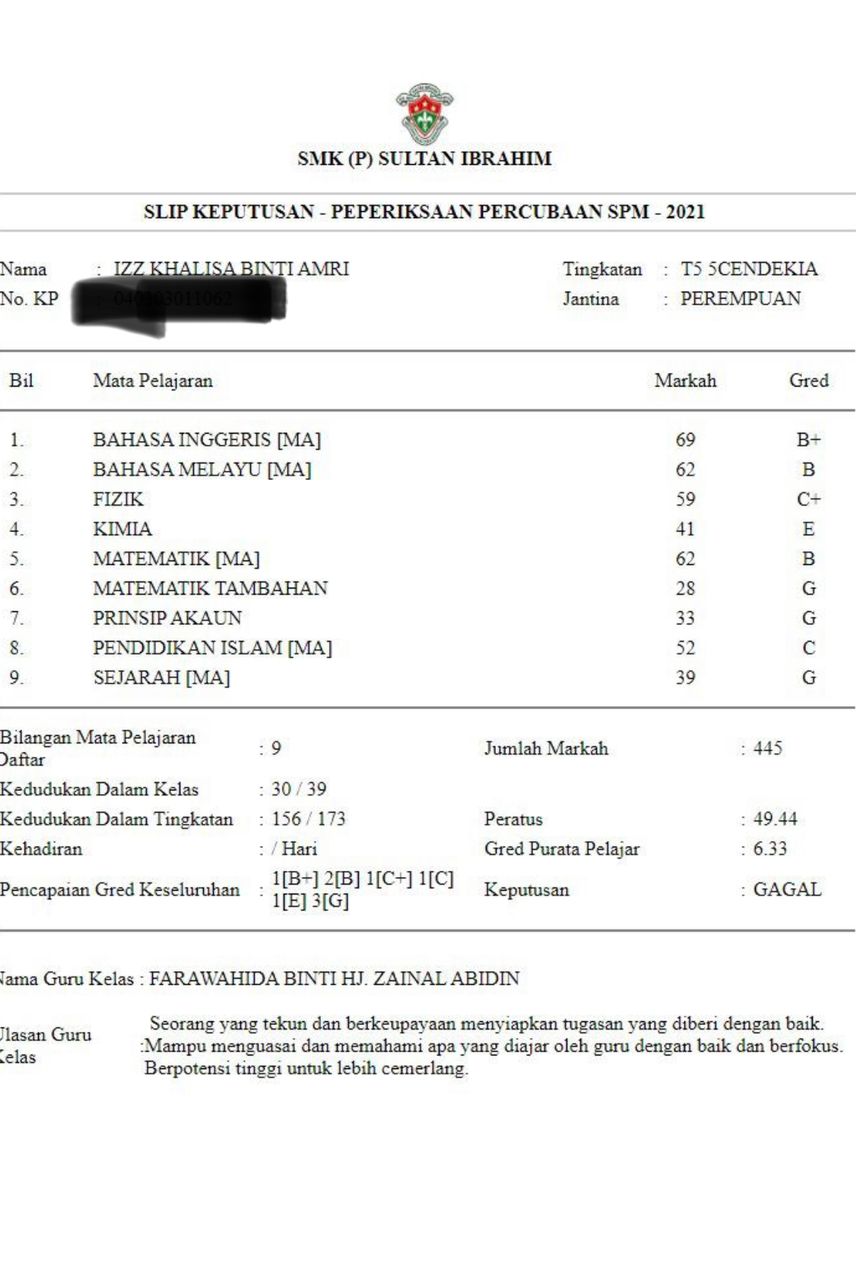 Demikian kata pelajar Izz Khalisa Amri, 18, yang mendapat keputusan 1B+, 2B, 1C+, 1C, 1E dan 3G ketika percubaan Sijil Pelajaran Malaysia (SPM) 2021 sebelum memperoleh keputusan cemerlang 5A 4B seperti yang tular di media sosial.
