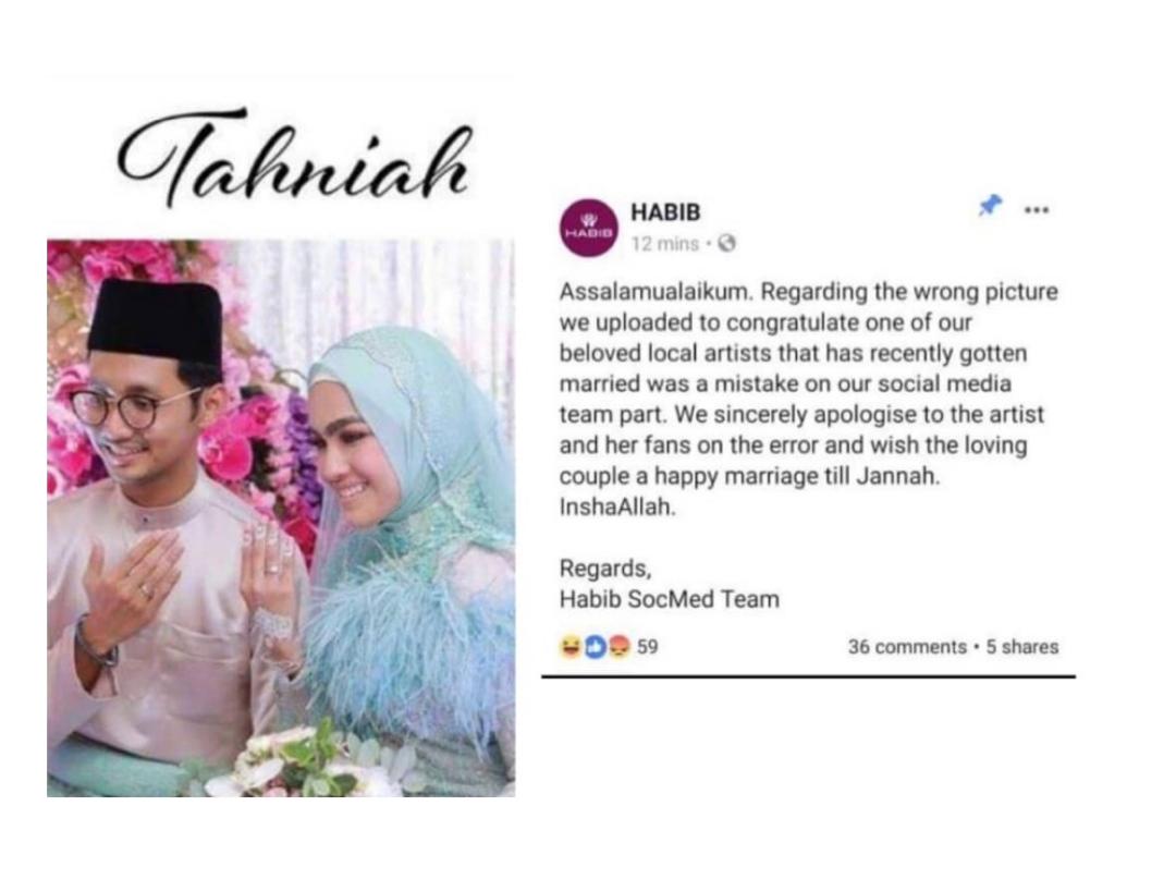 Syarikat barangan kemas, Habib Jewels menerusi laman sosialnya memohon maaf susulan kesilapan meletakkan gambar perkahwinan pelakon Elfira Loy, baru-baru ini.