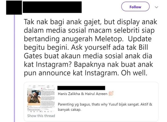 “Update begitu begini. Ask yourself ada tak Bill Gates buat akaun media sosial anak dia kat Instagram? Bapaknya nak buat anak pun announce kat Instagram. Oh well,” tulis individu tersebut.