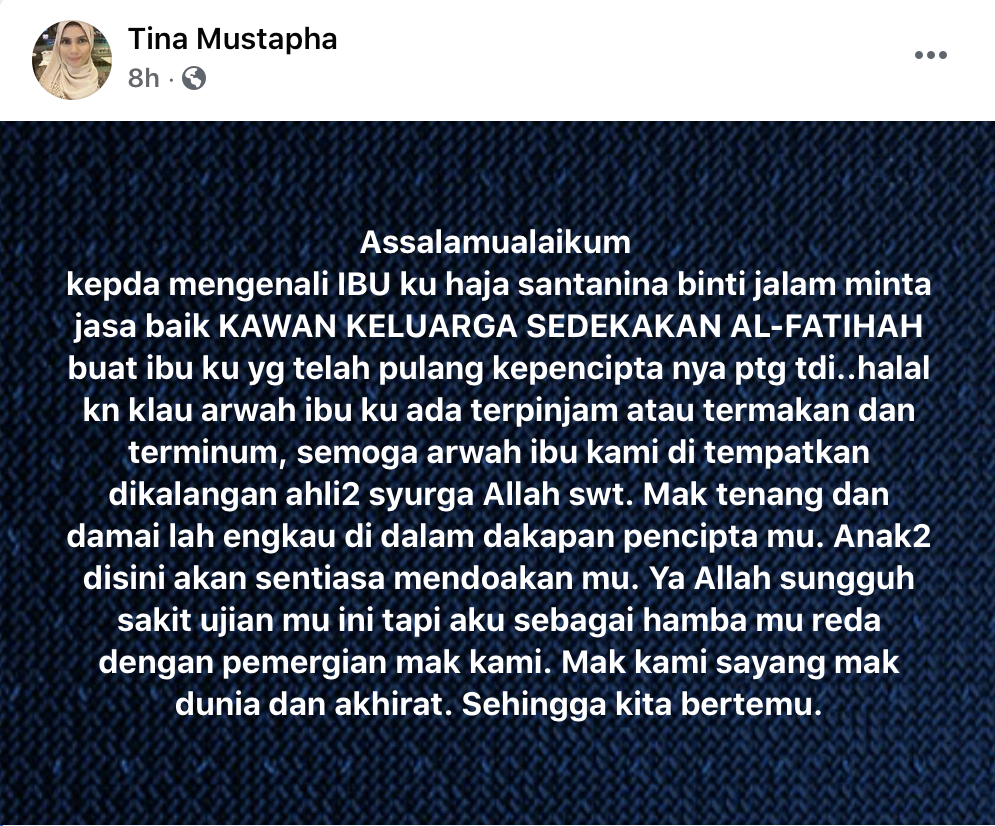 “Assalamualaikum kepda mengenali IBU ku haja santanina binti jalam minta jasa baik KAWAN KELUARGA SEDEKAKAN AL-FATIHAH buat ibu ku yg telah pulang kepencipta nya ptg tdi..halal kn klau arwah ibu ku ada terpinjam atau termakan dan terminum, semoga arwah ibu kami di tempatkan dikalangan ahli2 syurga Allah swt.