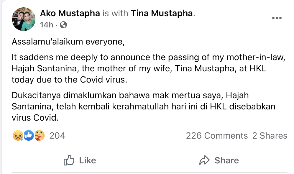 “Dukacitanya dimaklumkan bahawa mak mertua saya, Hajah Santanina, itu kepada isteri saya, Tina Mustapha telah kembali kerahmatullah hari ini di HKL disebabkan virus Covid,” tulisnya.