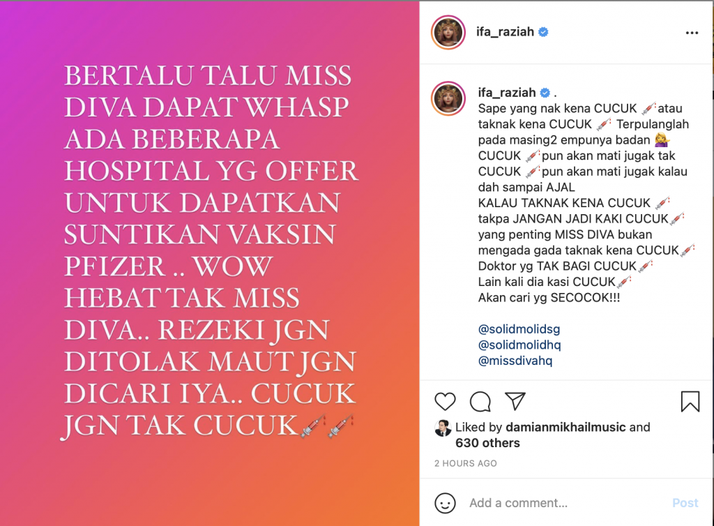 Ternyata tindakan penyanyi itu telah mendapat kecaman ramai kerana dia dikatakan memilih jenis vaksin. – KopiPlanet.com