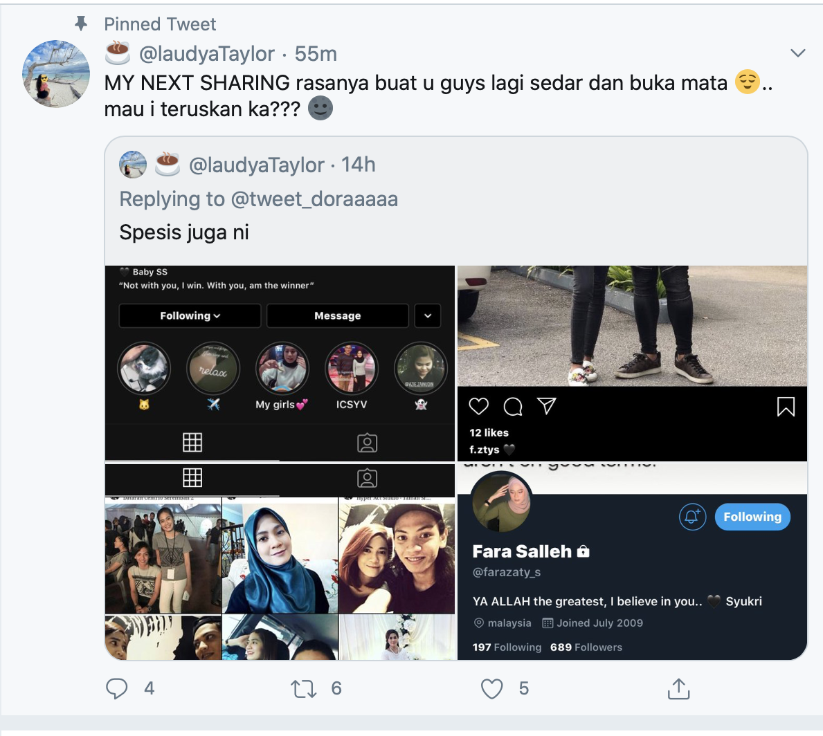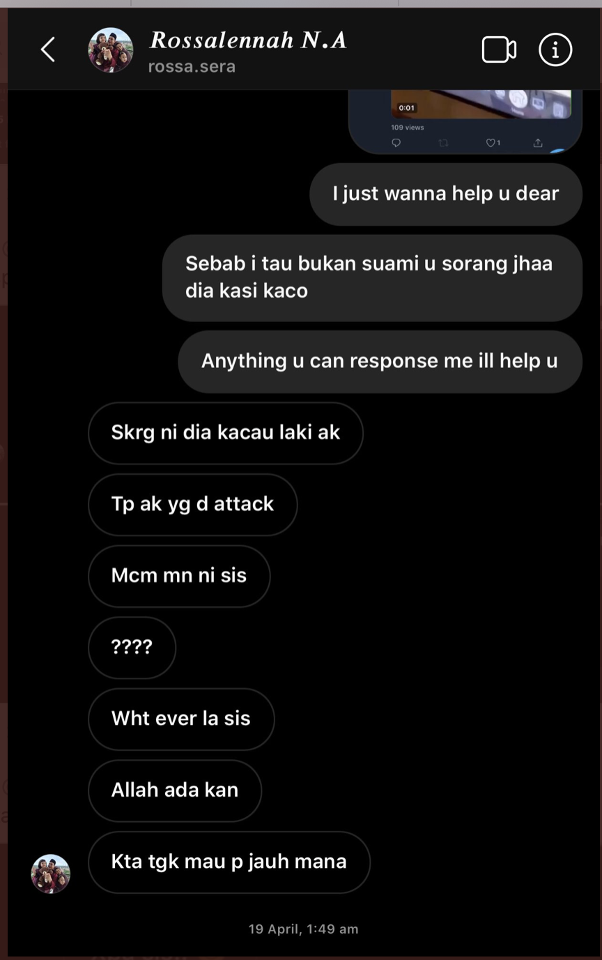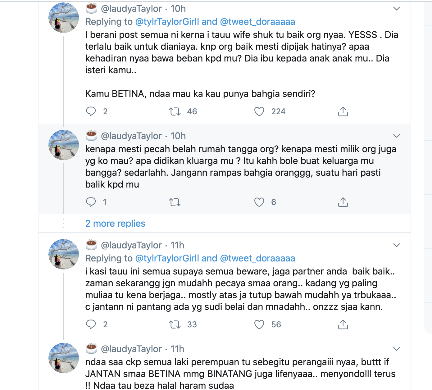 “Kenapa mesti pecah belah rumah tangga org? kenapa mesti milik org juga yg ko mau? apa didikan kluarga mu ? Itu kahh bole buat keluarga mu bangga? sedarlahh. Jangann rampas bahgia oranggg, suatu hari pasti balik kpd mu,” jelas individu berkenaan.