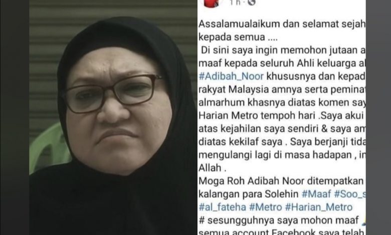 “Saya ingin memohon jutaan ampun dan Maaf kepada seluruh ahli keluarga almarhum Adibah Noor khususnya dan kepada semua rakyat Malaysia amnya di atas komen saya.