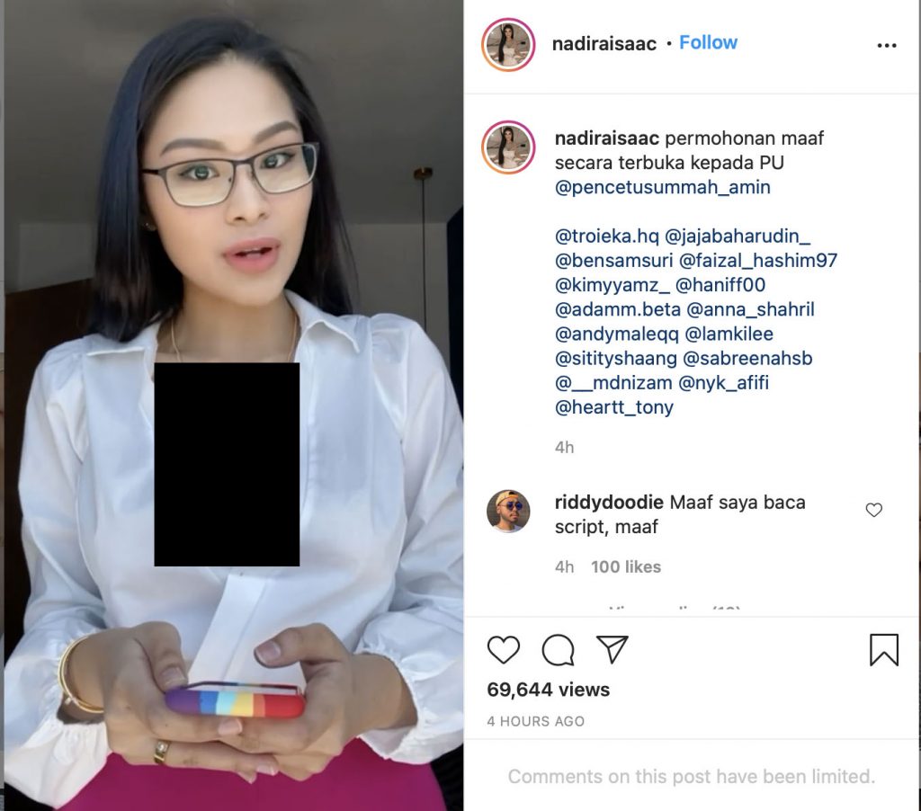Permohonan maaf tersebut dibuat oleh instafamous yang menggunakan nama @nadiraisaac di Instagram miliknya.