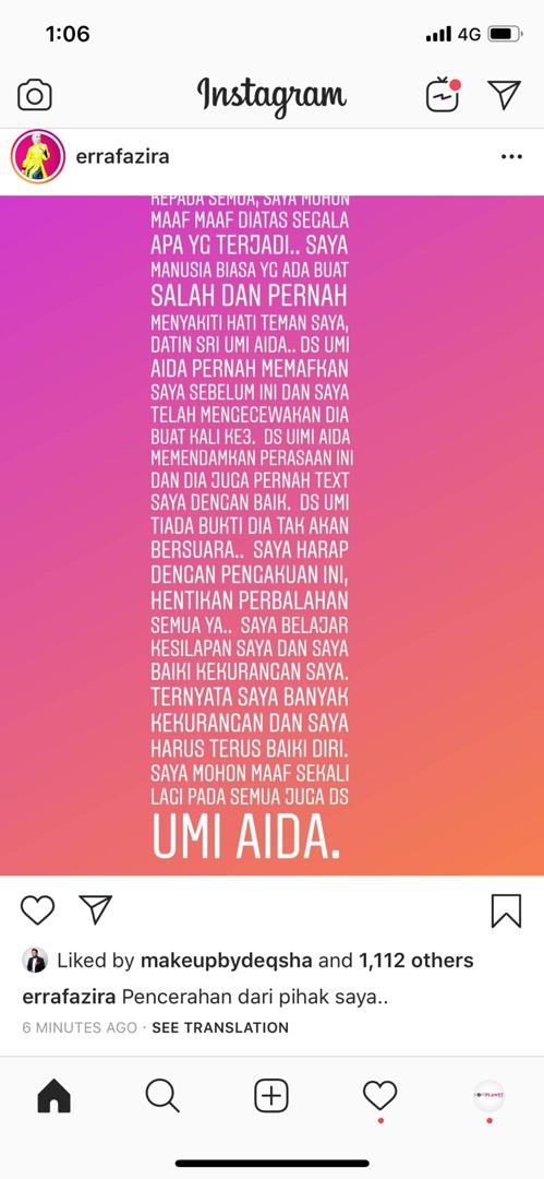 “Kepada semua, saya mohon maaf di atas segala apa yang terjadi. Saya manusia biasa yang ada buat salah dan pernah menyakiti hati teman saya, Datin Paduka Umie Aida. Umie pernah memaafkan saya sebelum ini dan saya telah mengecewakan dia buka kali ketiga.
