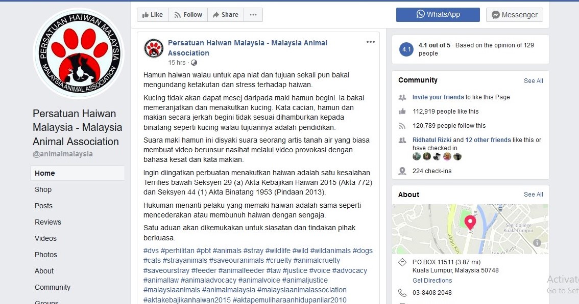 Sebelum ini, Persatuan Haiwan Malaysia menerusi kenyataan di Facebook menyatakan satu aduan akan dikemukakan untuk siasatan dan tindakan pihak berkuasa.