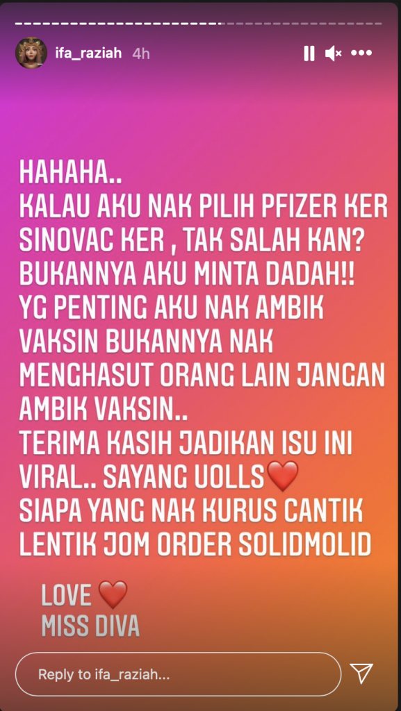 “Yang penting aku nak ambik vaksin, bukannya nak menghasut orang lain jangan ambil vaksin. Terima kasih jadikan isu ini viral,” ujarnya.