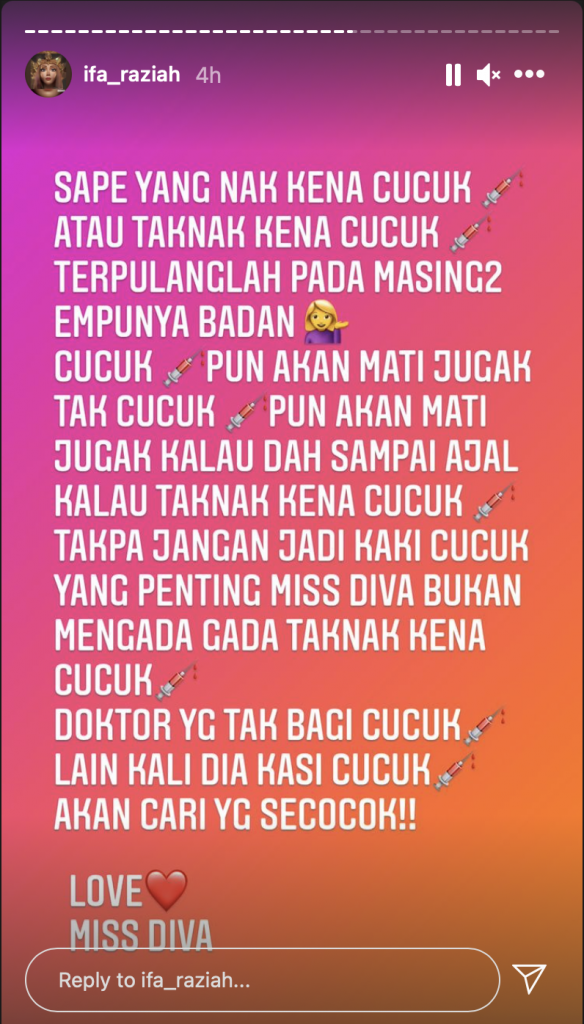 Sebelum ini, penyanyi berkenaan dikecam segelintir netizen kerana sanggup membatalkan temujanji untuk mendapatkan vaksin.