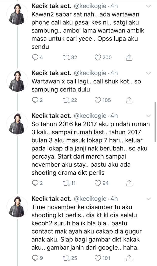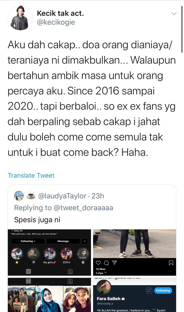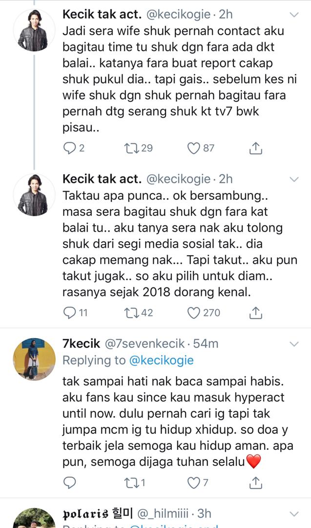 Menerusi Twitter miliknya, Kecik mengakui pernah tinggal serumah dengan Fara, malah mendedahkan kerap dipukul wanita itu ketika mereka tinggal bersama.