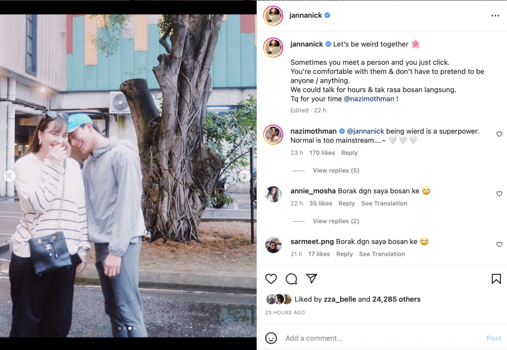 Pelakon dan pengacara, Janna Nick mencuri perhatian warganet selepas memuat naik foto mesra bersama pelakon, Nazim Othman menerusi hantaran di Instagramnya.