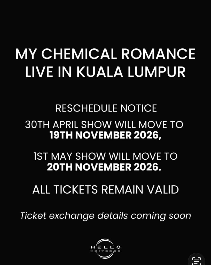 Konsert My Chemical Romance yang sepatutnya berlangsung pada 30 April & 1 Mei 2026 telah ditunda pada 19 & 20 November 2026.