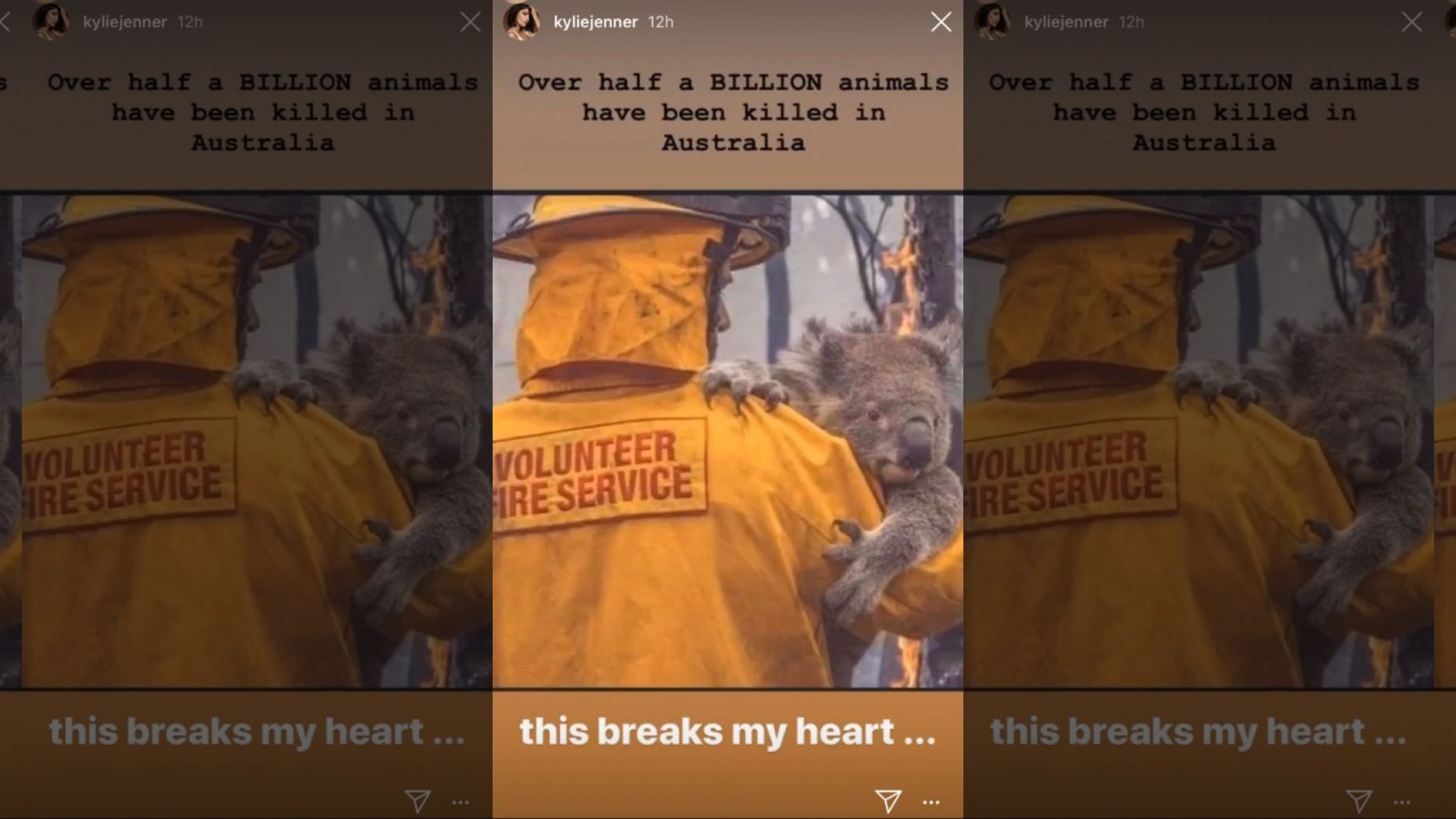 Sebelum berkongsikan gambar selipar tersebut, Kylie terlebih dahulu memuat naik imej menyedihkan lebih setengah bilion binatang terkorban akibat kebakaran hutan di Australia.