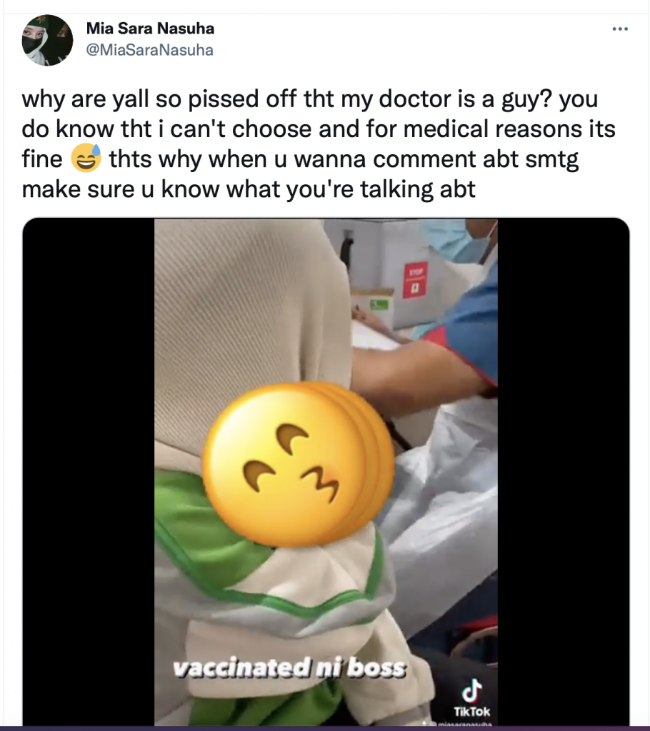 “Mengapa anda semua terlalu marah apabila doktor yang jalankan tugas menyuntik saya itu seorang lelaki? Anda pasti tahu saya tidak boleh memilih dan untuk tujuan perubatan ia bukan satu masalah (disuntik doktor lelaki).