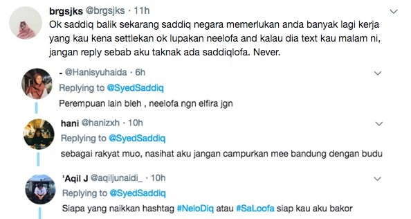 Sebagai contoh, seorang netizen @brgsjks menulis, “Ok Saddiq balik sekarang Saddiq, negara memerlukan anda. Banyak lagi kerja yang kau kena settlekan ok lupakan Neelofa dan kalau dia text kau malam ini, jangan reply sebab aku taknak ada Saddiqlofa. Never.”