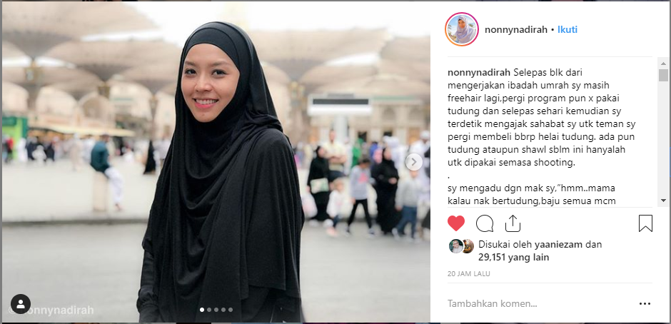 Menerusi entri di Instagramnya, Nonny telah memuat naik gambar dengan imej terbarunya berserta kapsyen panjang yang menceritakan detik penghijrahannya itu.