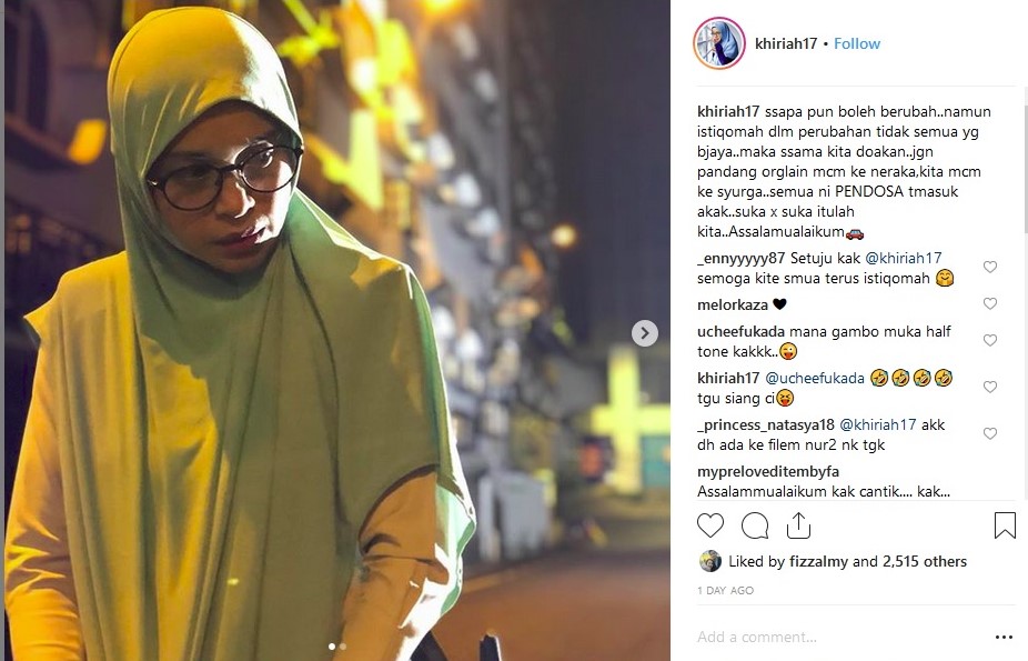 Khiriah, 43, berkongsi nasihat menerusi laman Instagram miliknya yang ringkas dan padat tentang perspektif netizen zaman sekarang.